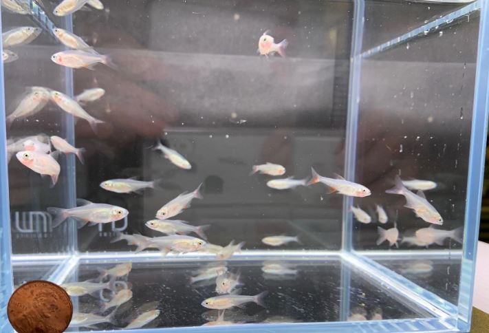 We placed a penny at the corner of the tank so you can have an idea of the size of the fish.