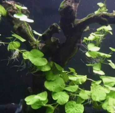 Brazilian Pennywort (Hydrocotyle leucocephala) is light green in color with round leaves that alternate down the length of the stem. This plant may be rooted or left to float at the surface. As the stems reach the surface, they may grow out of the water and produce small whitish flowers or spread along the surface of the water. It can tolerate a wide range of water conditions but will grow best and fastest under high light and in harder water.