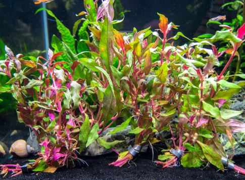 Alternanthera reineckii (Scarlet Temple) is popular stem plant within the hobby, known for it's nice red color. Can handle lower light and no Co2 but with looks it's best under those conditions. Sold as a potted plant.
